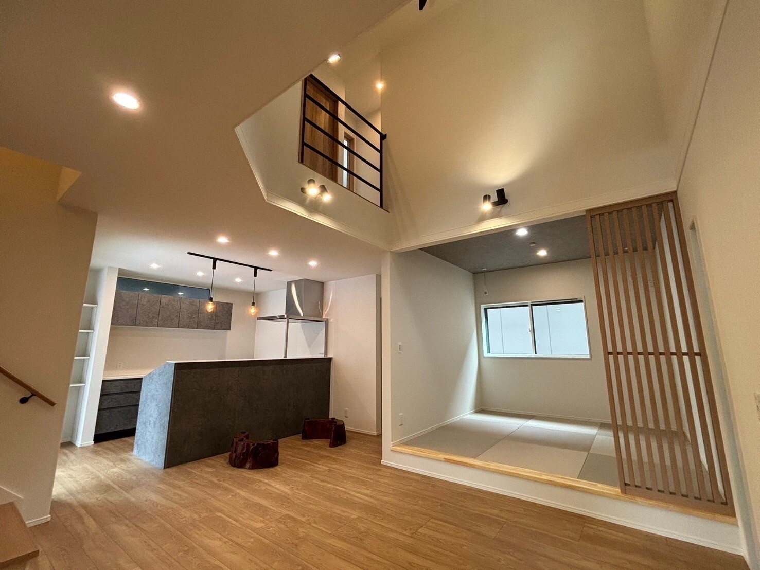 リビングは吹抜けと一段上がった和室黒いシーリングファンと一味違った照明が見事に調和してまるでホテルのようなオシャレな空間が広がっています。